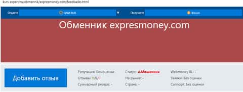 Контора Экспресс Мани засветилась еще на одном интернет-сайте, который ведет статистику отзывов и мнений в интернет-пространстве. Кухня Экспресс Мани попала в черный список со статусом "Мошенник", так как пришло много различных жалоб и негативных отзывов на нее.