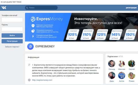 Мошенники ExpresMoney не отстают от прогресса и проводят активную рекламную компанию в социальных сетях. Далее представлен скриншот из группы Вконтакте, где можно увидеть как она выглядит, и в случае, если вас пригласят туда, вы будете предупреждены о потенциальной угрозе вашему финансовому положению
