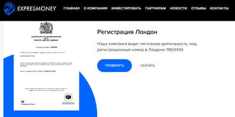 Информации о лицензии кухни Экспресс мани нет, так как по сути дела ее вообще не существует. Вместо этого, мошенники разместили у себя на сайте сертификат о создании компании в Лондоне. Правда это или просто нашли документы реальной компании с таким же названием, непонятно.