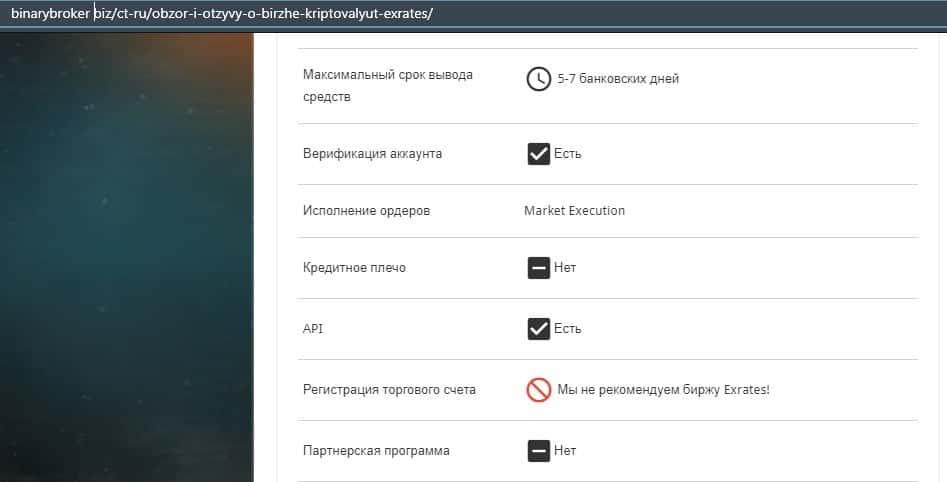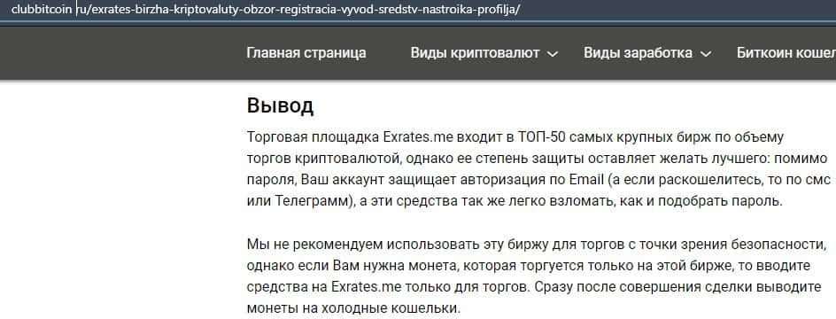Следующий обзор также не в пользу лохотронской биржи Эксрейтс, так как они не рекомендуют использовать эту биржу для торгов с точки зрения системы безопасности.