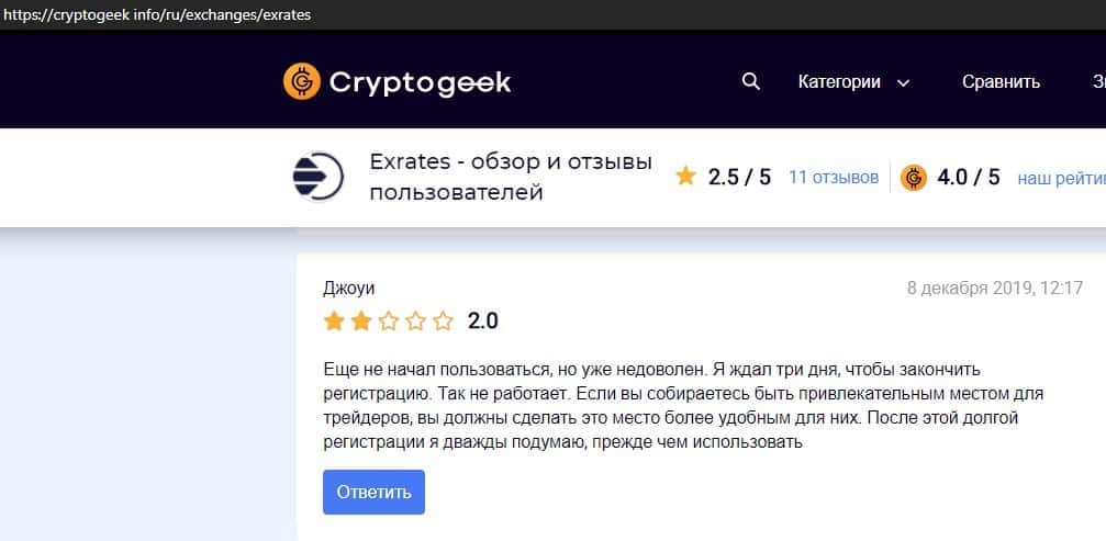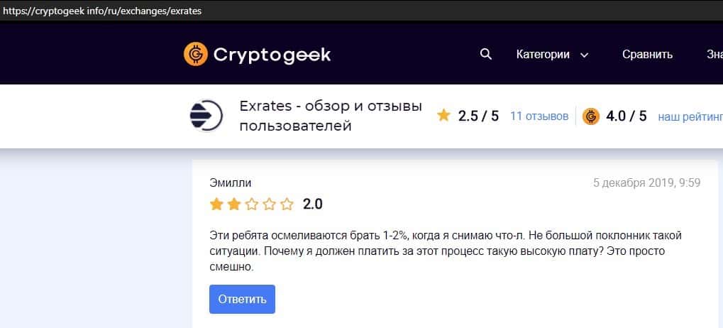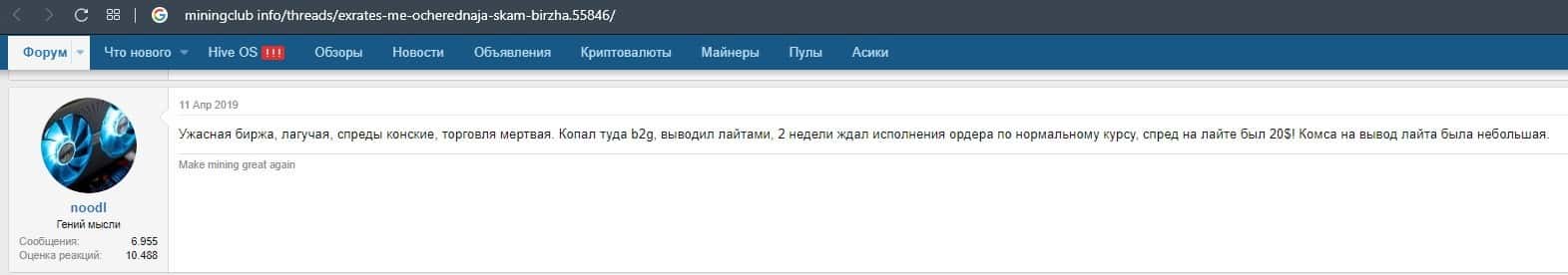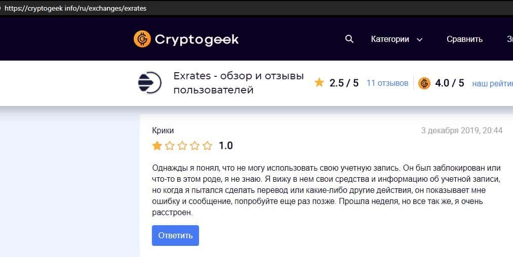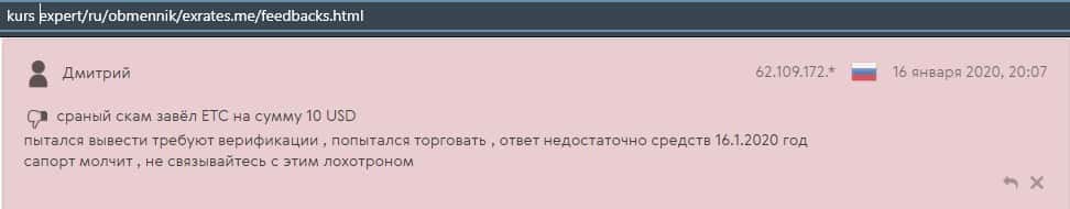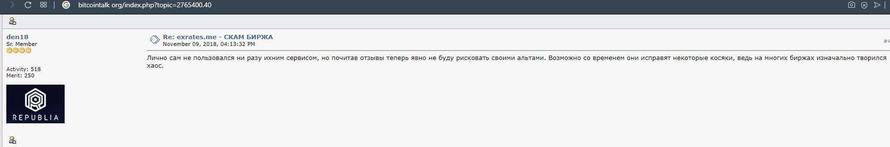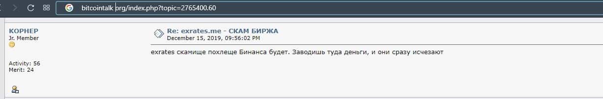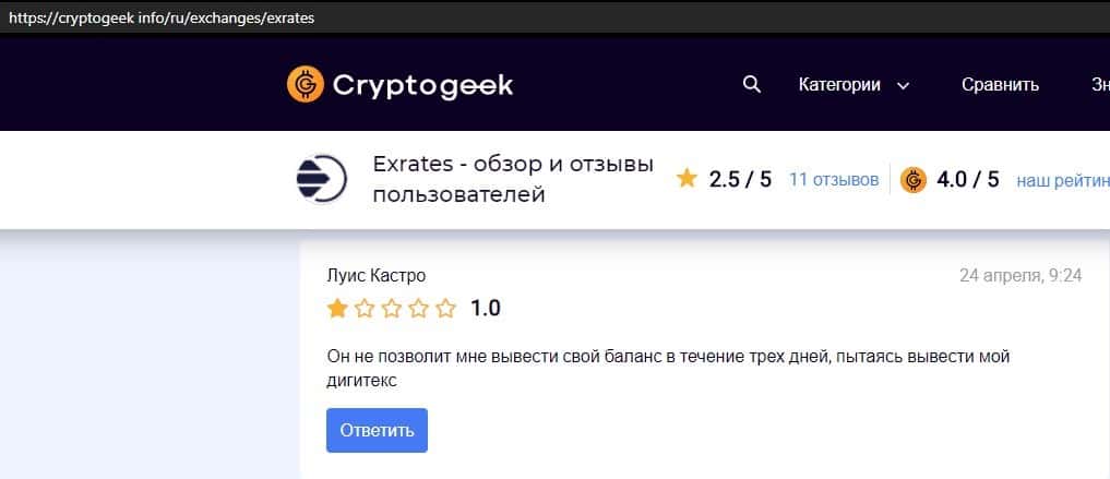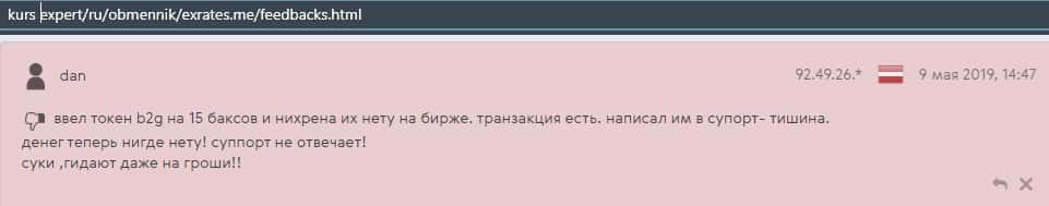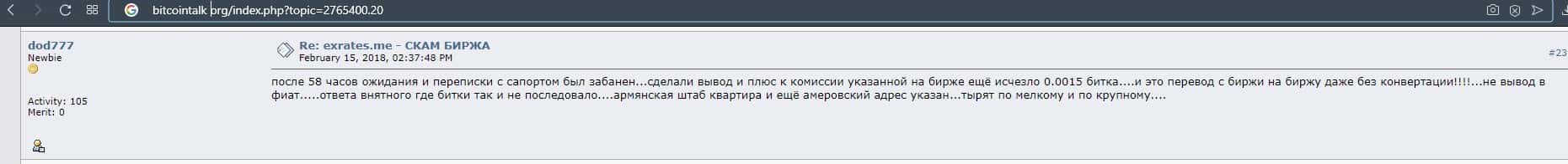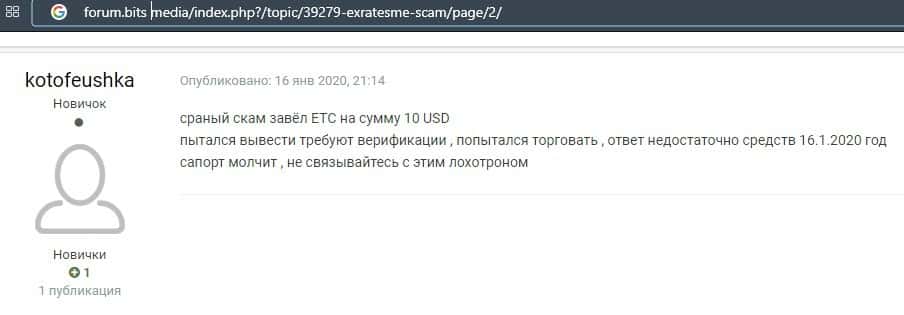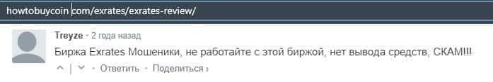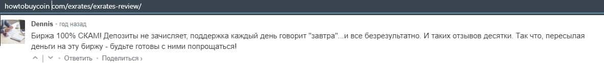 Еще один автор отзыва утверждает, что контора Эксрейтс хуже любой другой криптовалютной биржи, так как заводят туда деньги, а после этого они исчезают.