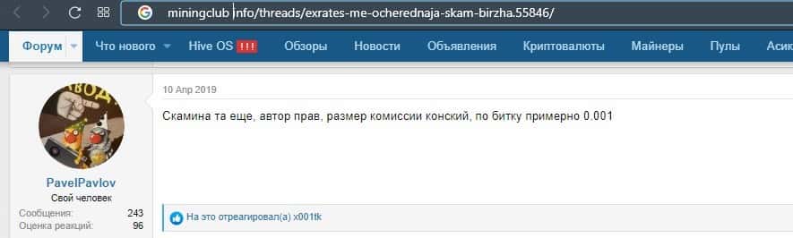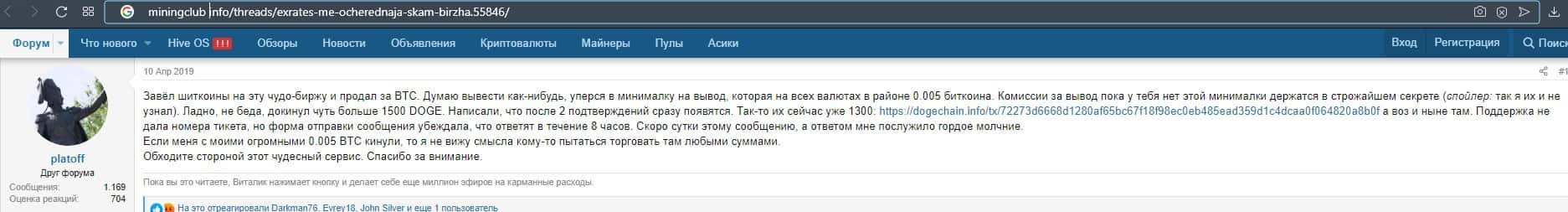 Еще один клиент утверждает, что контора Эксрейтс попросту не хочет выводить его дешевую криптовалюту. Как он только не пытался, все без результатов.