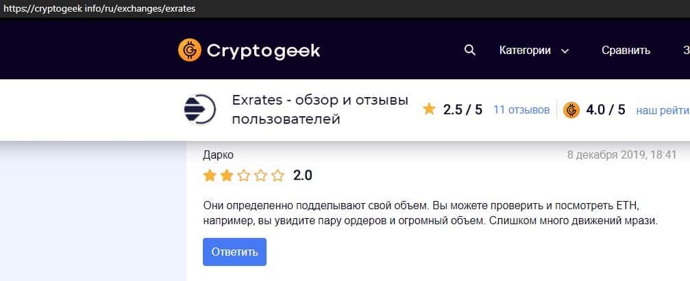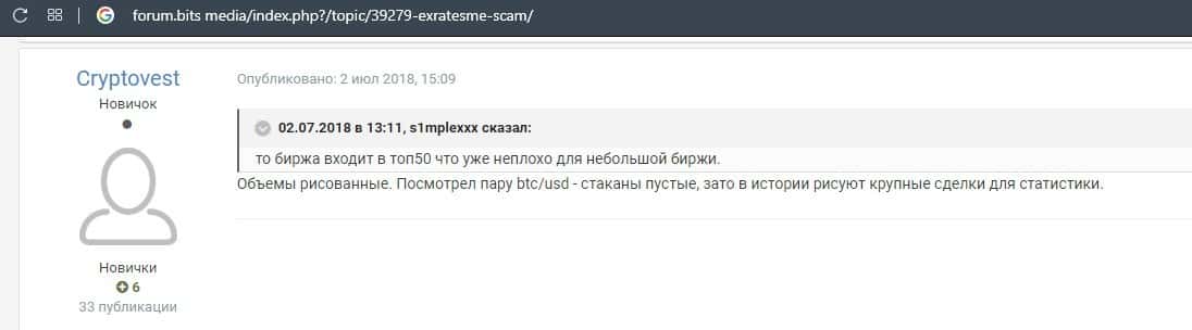 Далее представлен отзыв, где человек утверждает, что контора Эксрейтс специально накручивает объем по криптовалютам, дабы привлекать внимание пользователей.