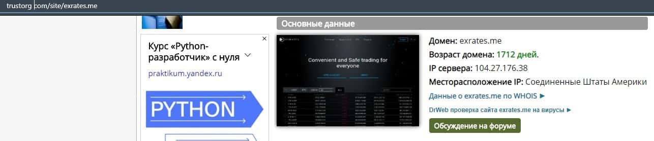 Лохотронская организация Эксрейтс по возрасту домена работает свыше 1712 дней, и данный домен скорее всего был раскручен кем-то и куплен мошенниками.