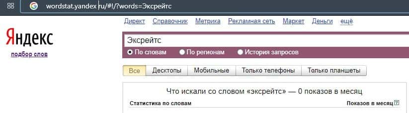 Чтобы проверить популярность конторы, мы решили проверить ее бренды на запросы в поисковой системе Яндекс. Бренд "Эксрейтс" не был найден за последний месяц ни разу.