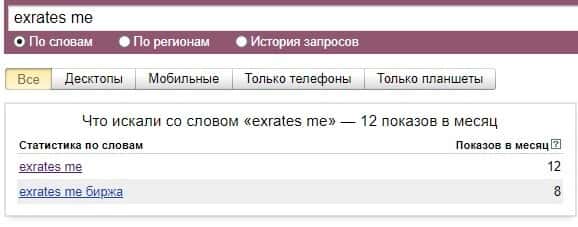 Если рассматривать запросы бренда по сайту "exrates me", то здесь контора набрала 12 показов в месяц, а соответственно показывает их низкую популярность.