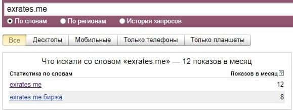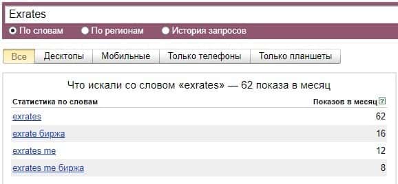 Немного другая ситуация и с запросом в поисковике Яндекс бренда "Exrates". Данный бренд слов набрал 62 показа в месяц по версии Яндекс Вордстат.
