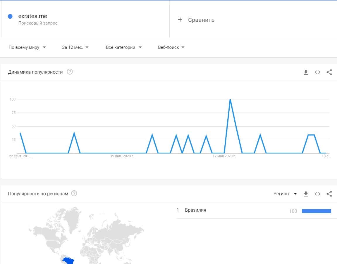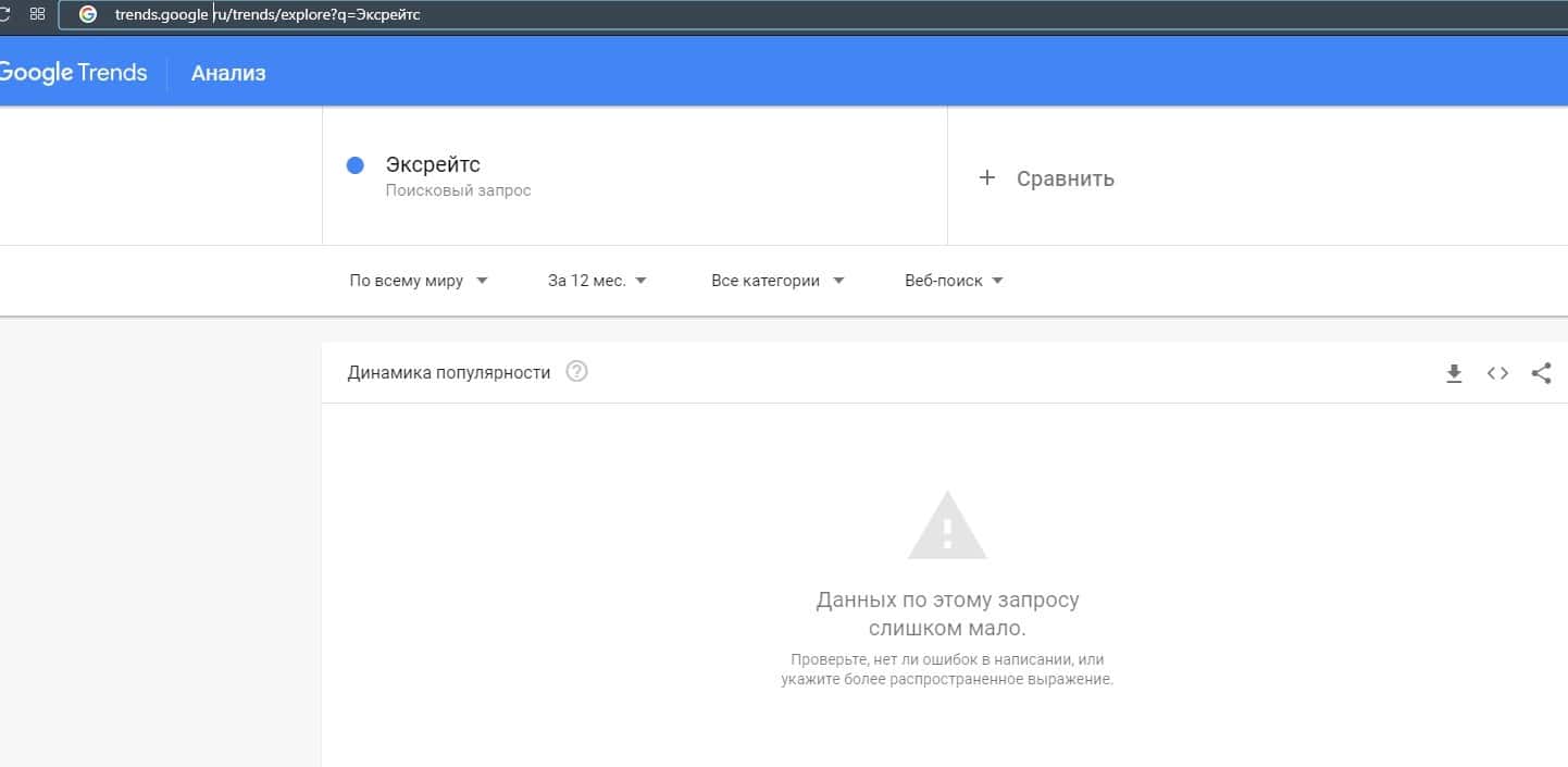 Если посмотреть по статистике Гугл Трендс бренд самого сайта "exrates me" без точки, то система не выдает ничего, так как мало запросов.