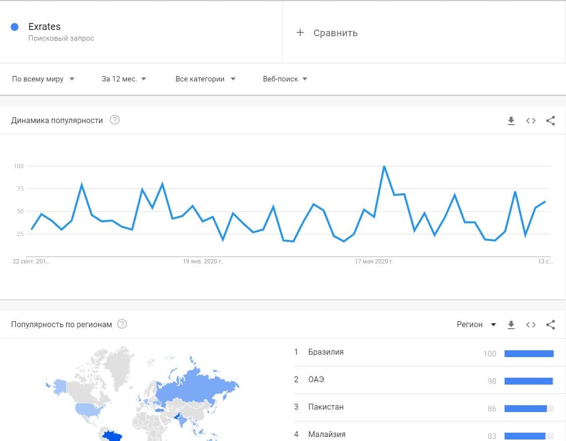 Та же ситуация и с запросом бренда "Exrates", и здесь есть кое-какая популярность, так как Гугл получал запросы в основном из Бразилии, ОАЭ, Пакистана и Малайзии.