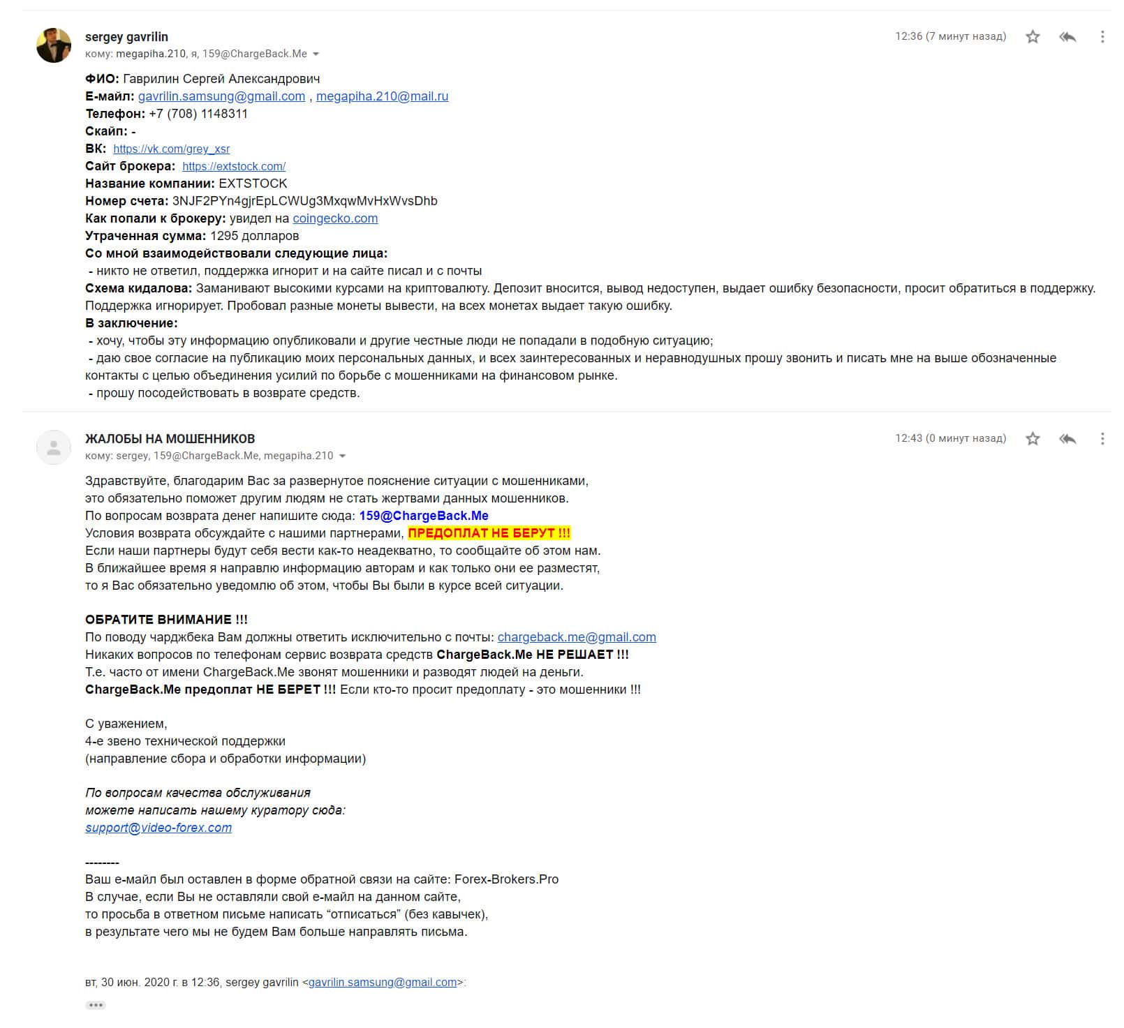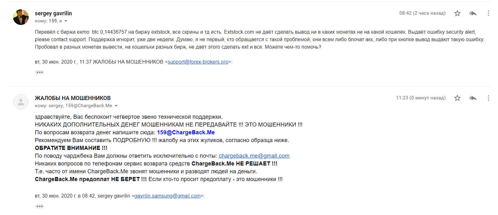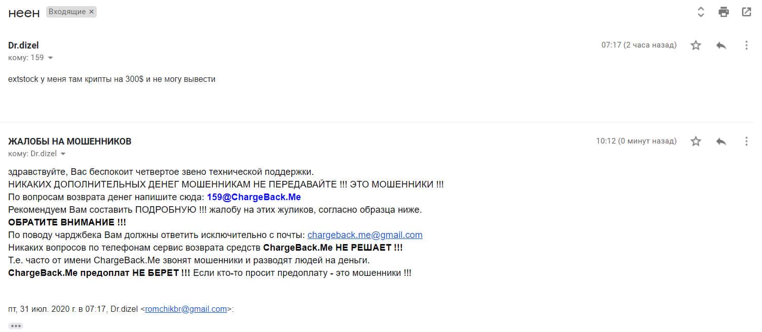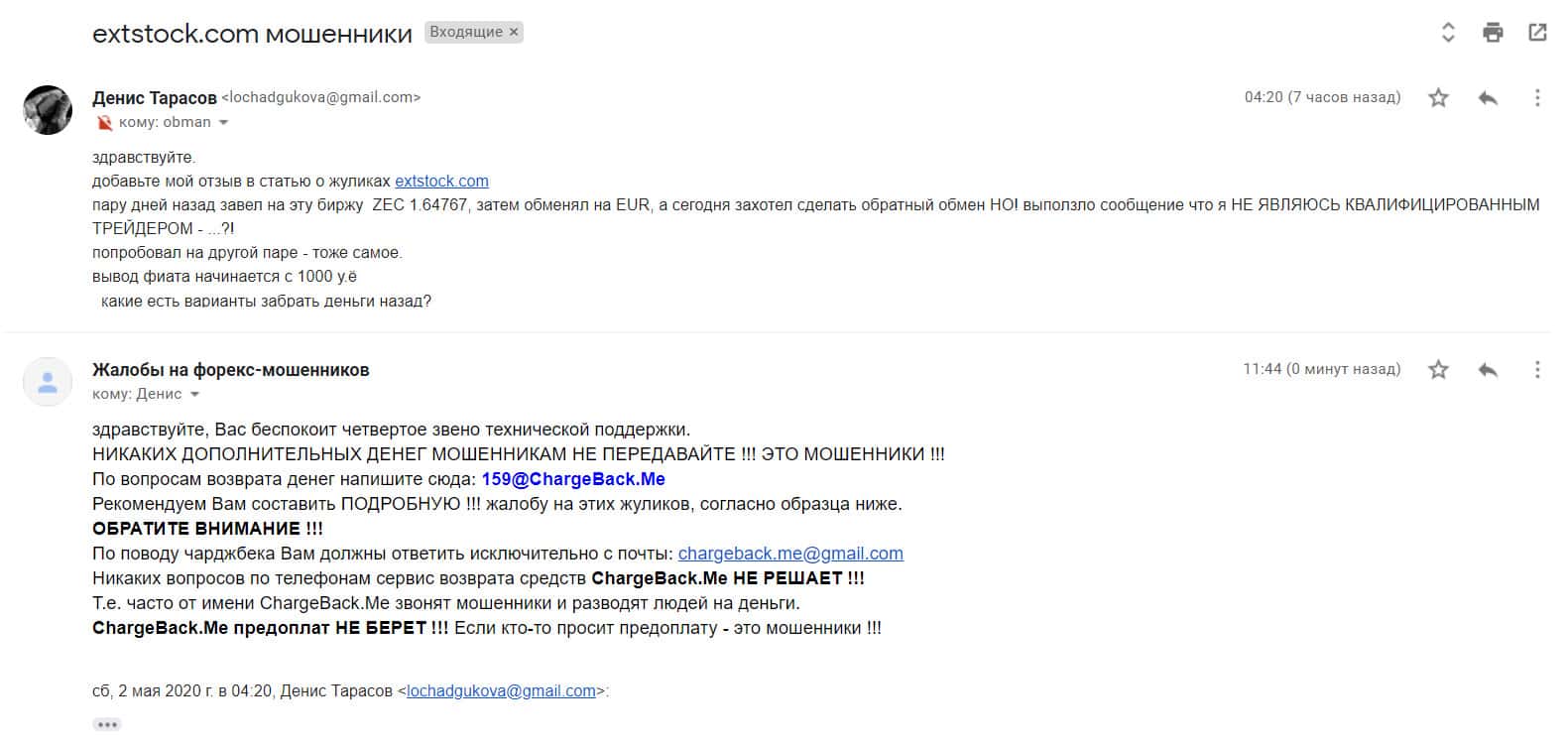 Спустя некоторое время на электронный ящик сайта-разоблачителя мошенников пришла подробная жалоба на мошенническую компанию ExtStock, где обманутый клиент криптовалютной биржи детально описал то, что с ним произошло.