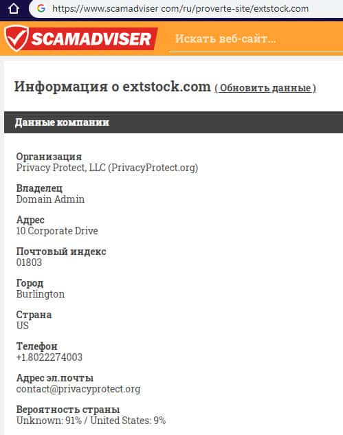 В связи с мошеннической и противозаконной деятельностью лохотрона Экст Сток его реальные руководители предпочитают анонимность дабы избежать ответственности со стороны правоохранительных органов. Техническую же информацию о сайте жулья ExtStock можно узнать с помощью портала scamadviser com, что вы можете увидеть на изображении ниже.