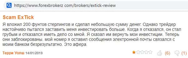 Обманутый клиент брокерской конторы ЭксТик на странице интернет-сайта forexbrokerz com рассказал, как он внес на депозит 263 фунта стерлингов, а затем попробовал их возвратить, но непонятный «менеджер по работе с клиентами» пытался, вместо оказания помощи, всячески этому воспрепятствовать.