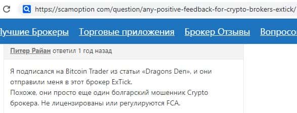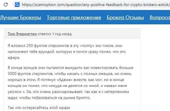 Обманутый трейдер жалуется на компанию Экстик на странице сайта scamoption com