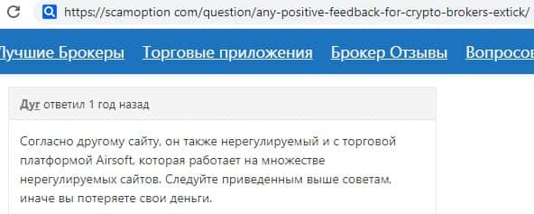 Умудренный опытом трейдер на странице интернет-портала scamoption com советует подальше держаться от мошенников из брокерской компании ЭксТик, так как она не имеет лицензии и не регулируется надзорными финансовыми органами.