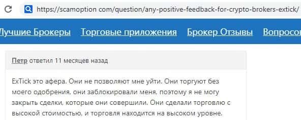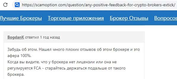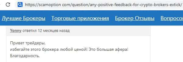 - Избегайте сотрудничества с брокерской компанией ЭксТик - призыв трейдера на сайте scamoption com