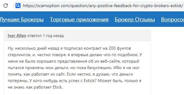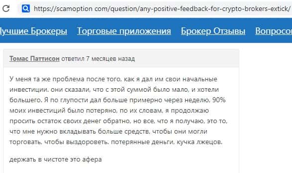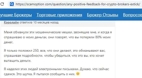 Клиент брокерской конторы Экстик на странице веб-сайта scamoption com жалуется, что потерял деньги