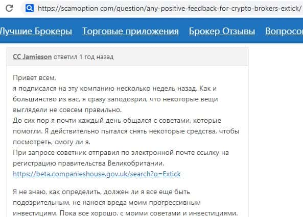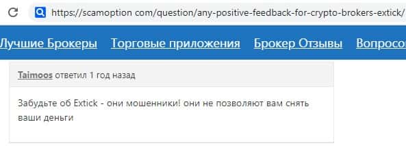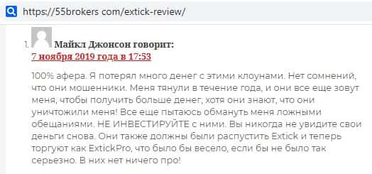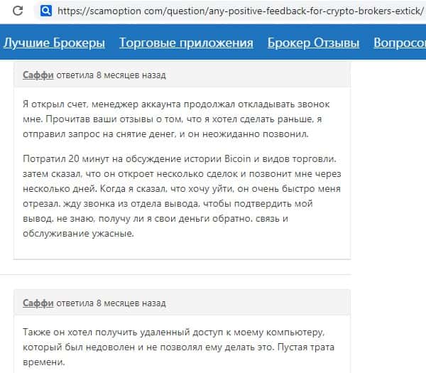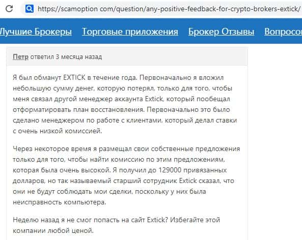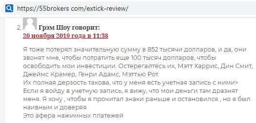 - Клиент брокерской конторы Экстик на странице веб-сайта scamoption com жалуется, что потерял деньги