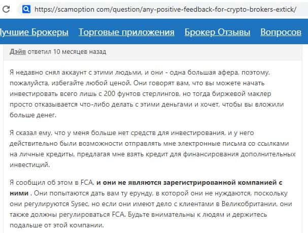 - Компания Экстик - ненадежный брокер, так как не регулируется FCA