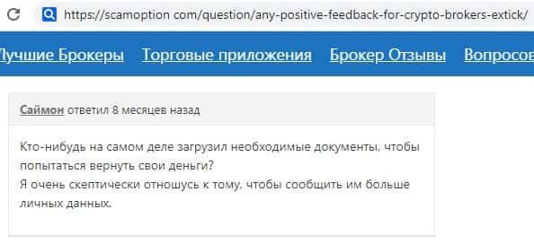 Мошенники из брокерской компании Экстик требуют от клиента для осуществления вывода денежных средств предоставления каких-то документов, не предусмотренных первоначальным соглашением, и трейдер небезосновательно боится утечки своих конфиденциальных сведений.