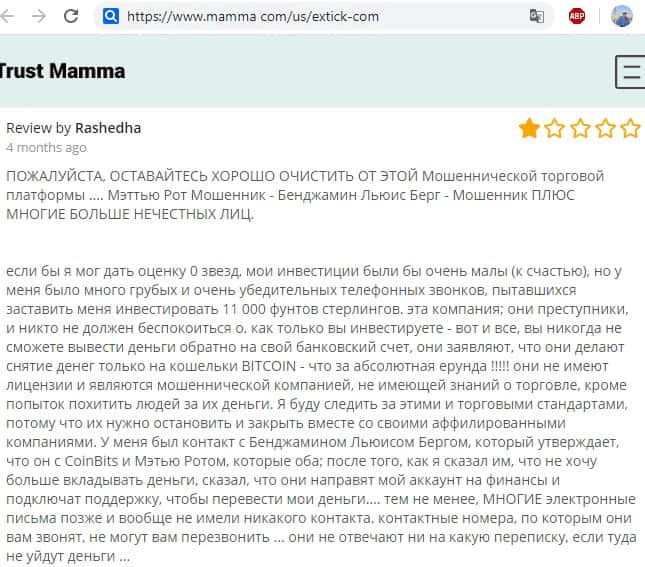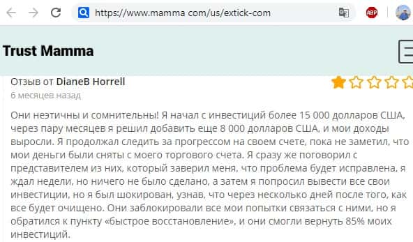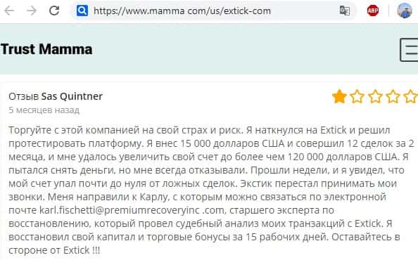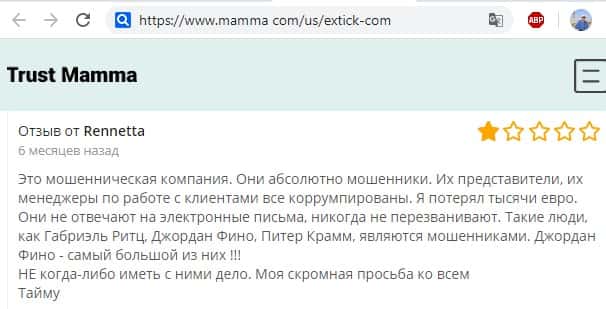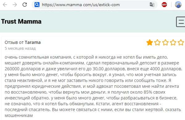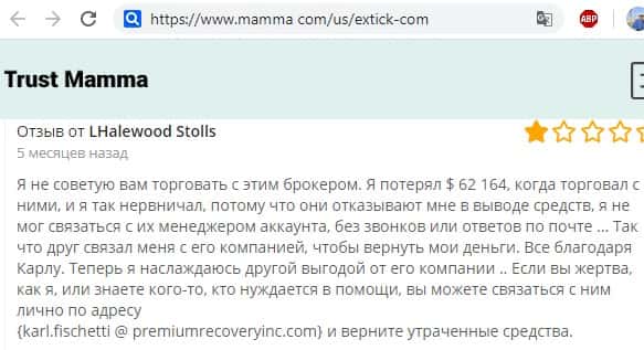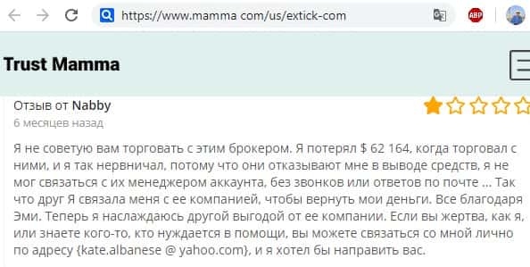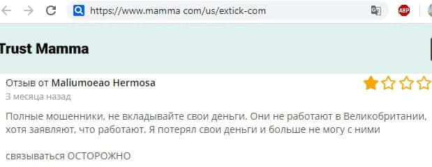 - Отзыв обманутого трейдера о конторе ЭксТик на информационном сайте mamma com
