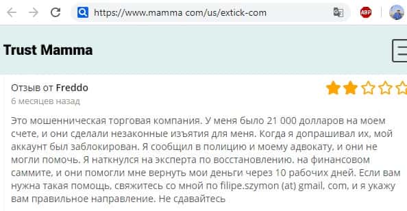 Биржевой трейдер, связавшийся с мошеннической брокерской компанией ЭксТик, на веб-сайте mamma com рассказал, что он мог бы лишиться в результате этой аферы 86000 долларов, если бы ему не помогли специалисты по восстановлению из специальных служб.