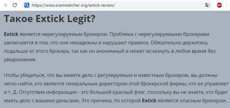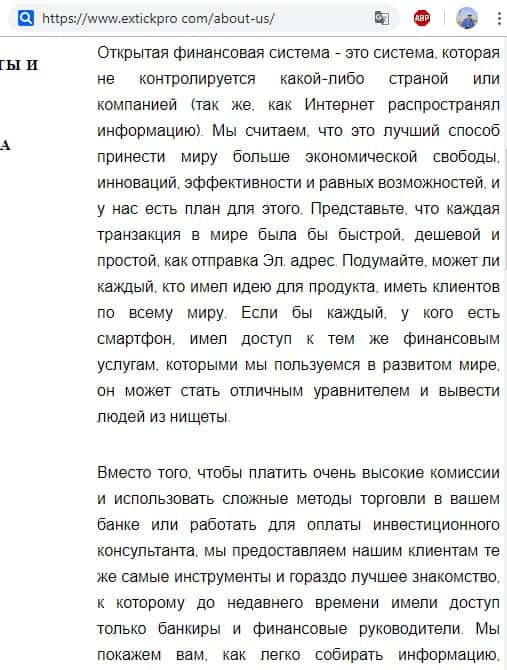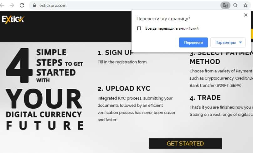 Домашний портал брокера Extick Com не переведен на русский язык и поэтому малодоступен для российских пользователей, что может быть и неплохо при общении с мошенниками. А вот все сведения об этом ресурсе для данной статьи пришлось собирать с использованием интернет-переводчиков.
