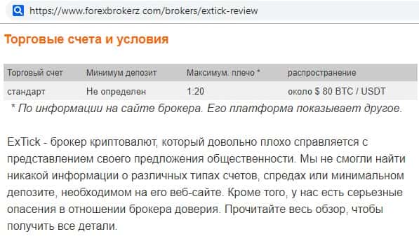 - Вот так оценивают торговые условия брокерской компании ЭксТик в обзоре на forexbrokerz com