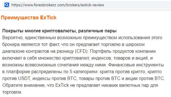 Мошенники из брокерской компании ExTick широко рекламируют свои положительные стороны и преимущества при организации торговли и работе с клиентами. Однако, это далеко не так - считают на интернет-ресурсе forexbrokerz com.