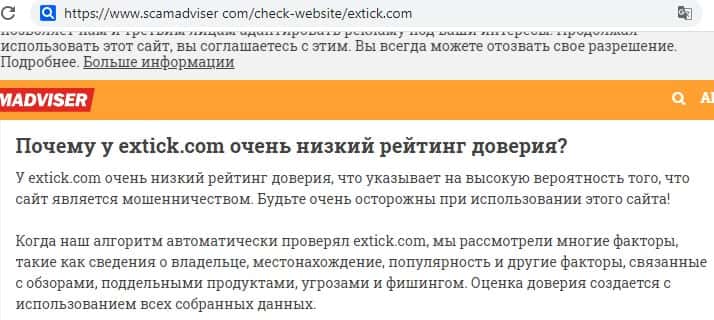 На интернет-ресурсе scamadviser com провели исследования брокерской компании ЭксТик и сделали вывод, что сайт этого брокера имеет весьма низкий уровень доверия, что может свидетельствовать о том, что и сама брокерская организация является мошеннической, и работать с ней вместе опасно.