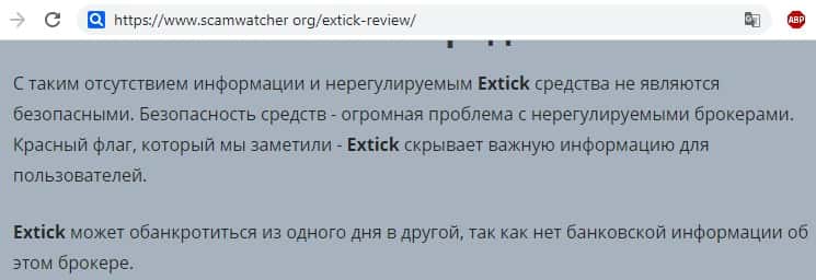 Несмотря на заявления менеджеров компании ExTick о ее благонадежности, выгодности и продвинутости, на официальном сайте, тем не менее, опубликован официальный отказ от всяческой ответственности за негативные последствия, возникающие у клиентов при торговле с этим брокером.