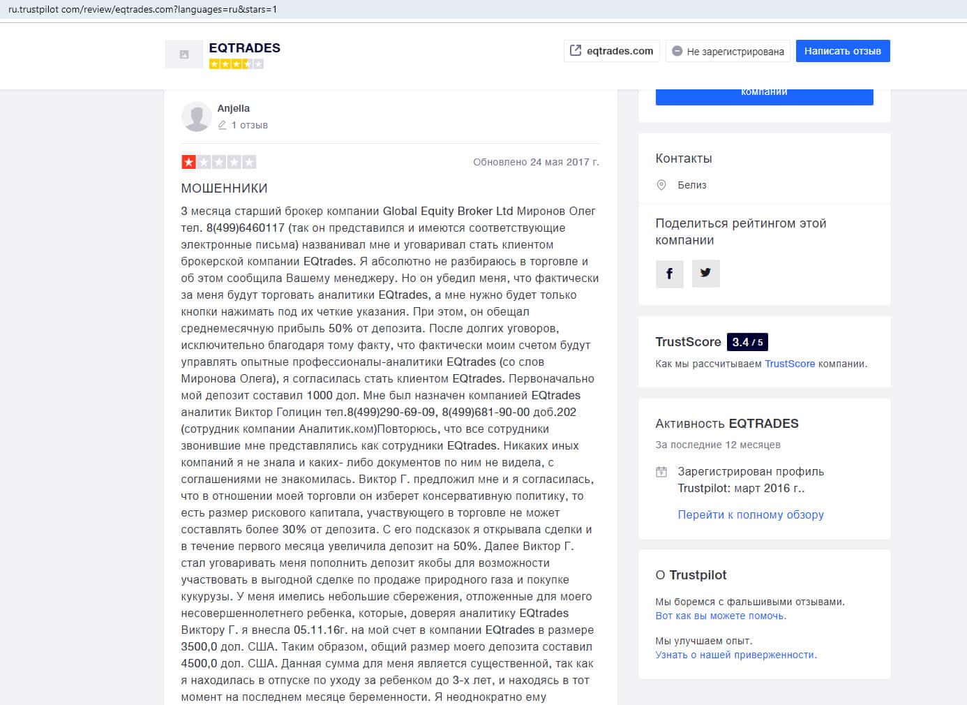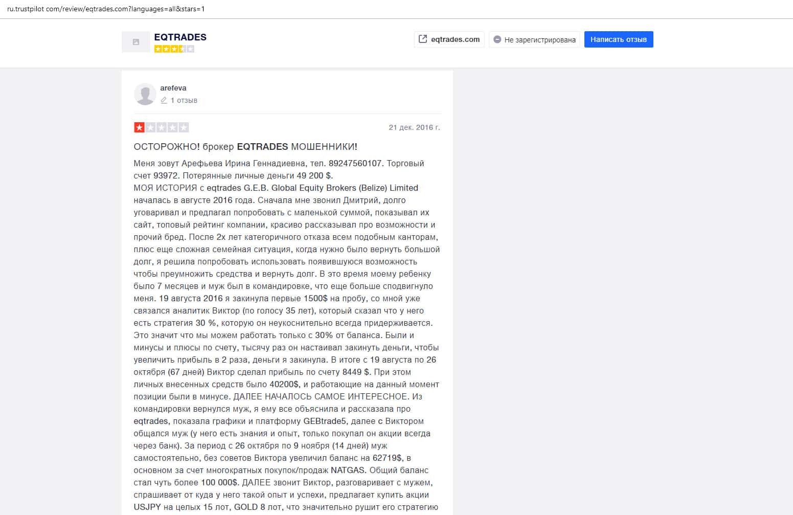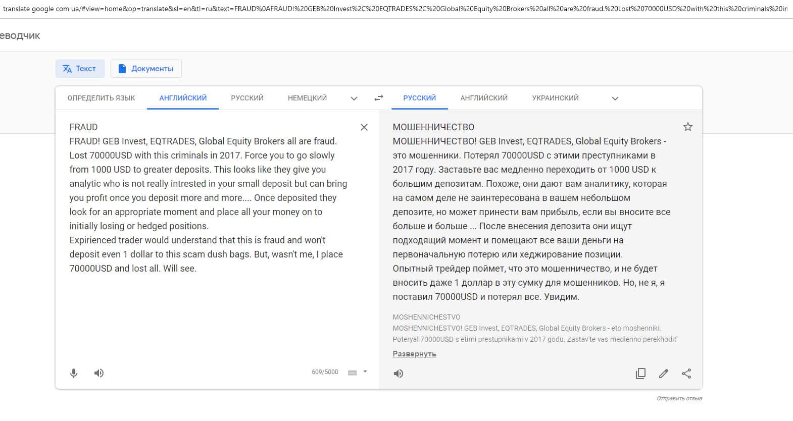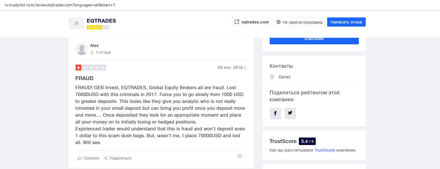 "МОШЕННИЧЕСТВО! GEB Invest, EQTRADES, Global Equity Brokers - это мошенники. Потерял 70000USD с этими преступниками в 2017 году..." - вот что пишет пользователь Alex, расстроившийся из-за потери крупной суммы денег.