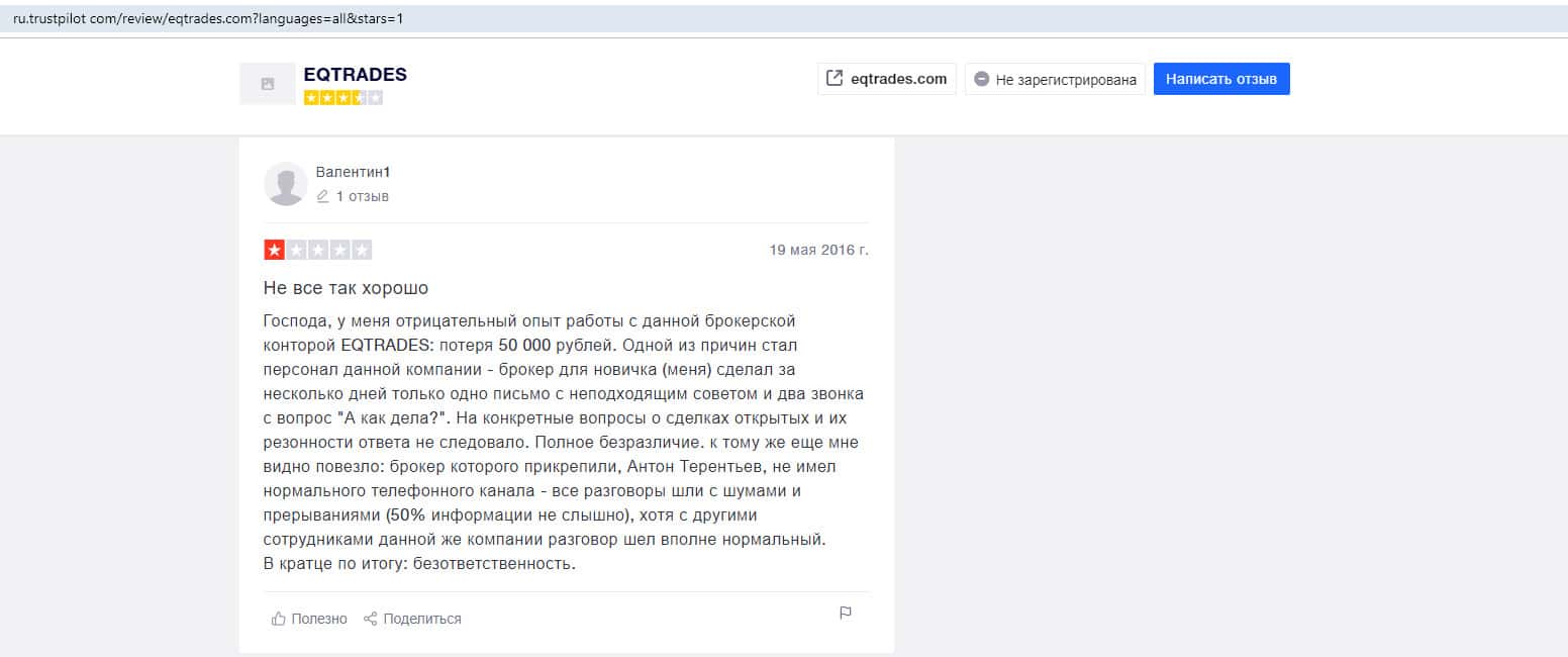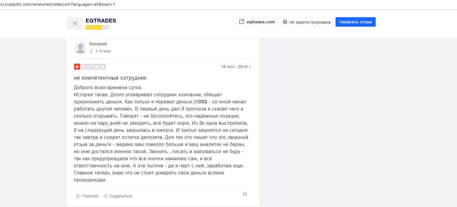 В интернете можно найти много отрицательных отзывов о ЕКью Трейд. Одним из обворованных клиентов стал Anjella. Ему очень долго названивал человек, который представился, как старший брокер, скорее всего это был просто мошенник. И как можно было догадаться, все деньги были утеряны.