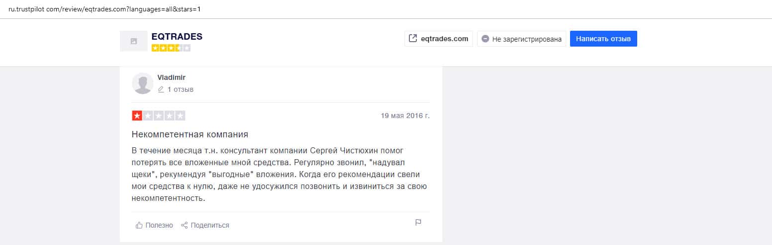 - Пользователю Vladimir также помог слить средства "опытный" аналитик EQTRADES