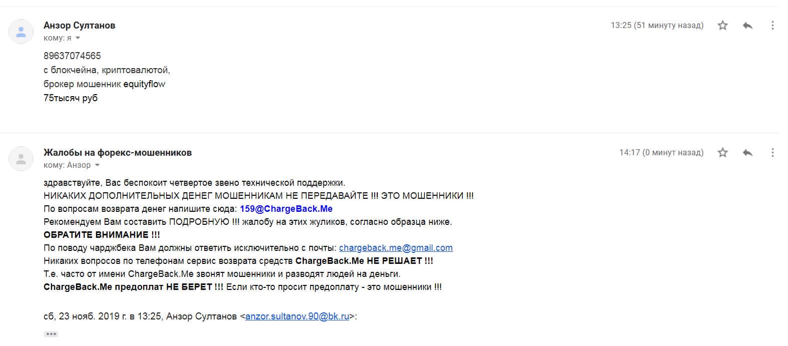 Еще одна брокерская контора Екьюти Флов обворовала клиента на некую сумму денег. Жертве предложили выгодную торговлю, после чего убедили во вкладе средств. Когда клиент заговорил о выводе депозита, мошенники слили его баланс. Во всей этой схеме разобраться и вернуть финансы поможет ChargeBack.Me