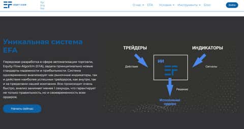 Начинается сайт у аферистов Екьюти Флов с типичной шапки сайта, в которой мошенники Equity Flow чередуют мотивирующие надписи о своей выдуманной уникальности и очередным "чудо" технологиям. На изображении, расположенном ниже, вы можете увидеть шапку сайта лохотрона Екьюти Флов.