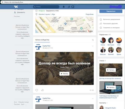 Имеется у мошенников Екьюти Флов и страница в социальной сети Вконтакте, в которой ситуация аналогичная предыдущей, а именно подписчиков на странице такое же количество, а активности никакой в группе нету. На изображении, расположенном ниже, вы можете увидеть группу лохотрона Equity Flow в социальной сети Вконтакте.