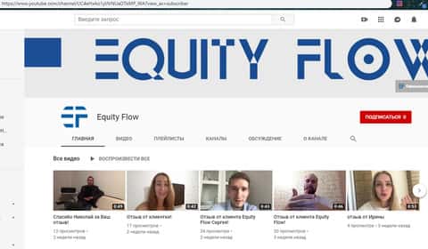 Ну и для размещения различных фейковых видео отзывов аферисты Equity Flow создали страницу в социальной сети YouTube, в которой уже имеются видео с купленными отзывами. Но вот подписчиков и активности на канале лохотрона Екьюти Флов нету. На изображении ниже вы можете увидеть канал шулеров Equity Flow в Ютубе.