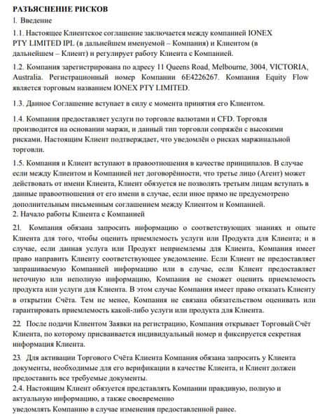 Далее практически все условия у шулеров Equity Flow состоят из информации о том, как именно происходит торговля в кухне Екьюти Флов, которые не несут в себе никакой информационной и смысловой нагрузки. На изображении, расположенном ниже, вы можете увидеть отказ шулеров Equity Flow от ответственности.