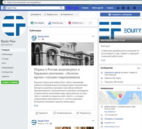 Дабы соответствовать современным трендам лохотрон Equity Flow решил обзавестись страницами в социальных сетях, одной из которых является Facebook. На данной странице у аферистов Екьюти Флов у шулеров накручено пол тысячи подписчиков, однако на записях никакой активности аудитории абсолютно нету.