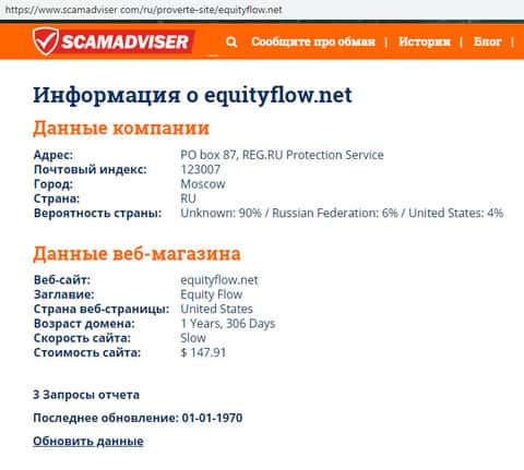 В связи с мошеннической и противозаконной деятельностью руководители лохотрона Equity Flow предпочитают анонимность дабы избежать ответственности со стороны правоохранительных органов. Аферисты Екьюти Флов скрывают даже местоположение своего сайта, о чем можно узнать с помощью портала scamadviser com.