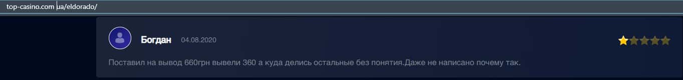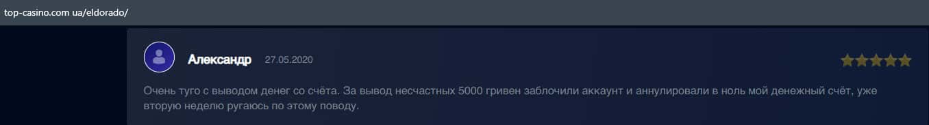Человек указал в свем отзыве, что контора EldoradoCasino не вывела ему порядка 5000 гривен, при этом заблокировали аккаунт. В поддержке сказали, что на его счету ноль.