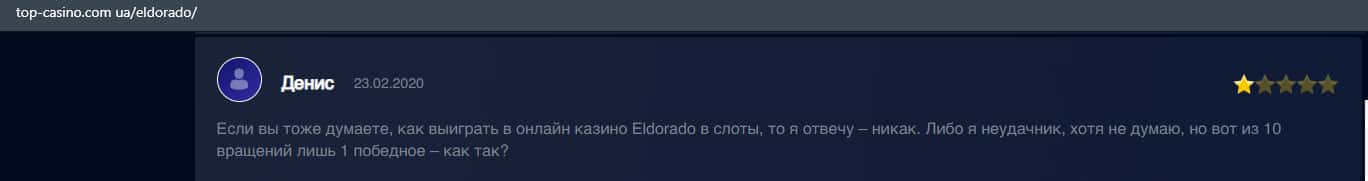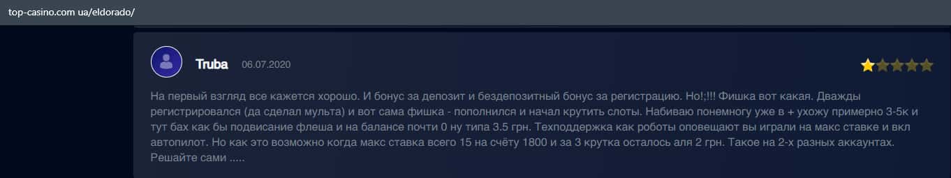 Ниже представлен отзыв в котором клиент заявляется, что не советовал бы играть в онлайн-казино Эльдорадо Казино. По его мнению это обычный проект для развода на деньги.