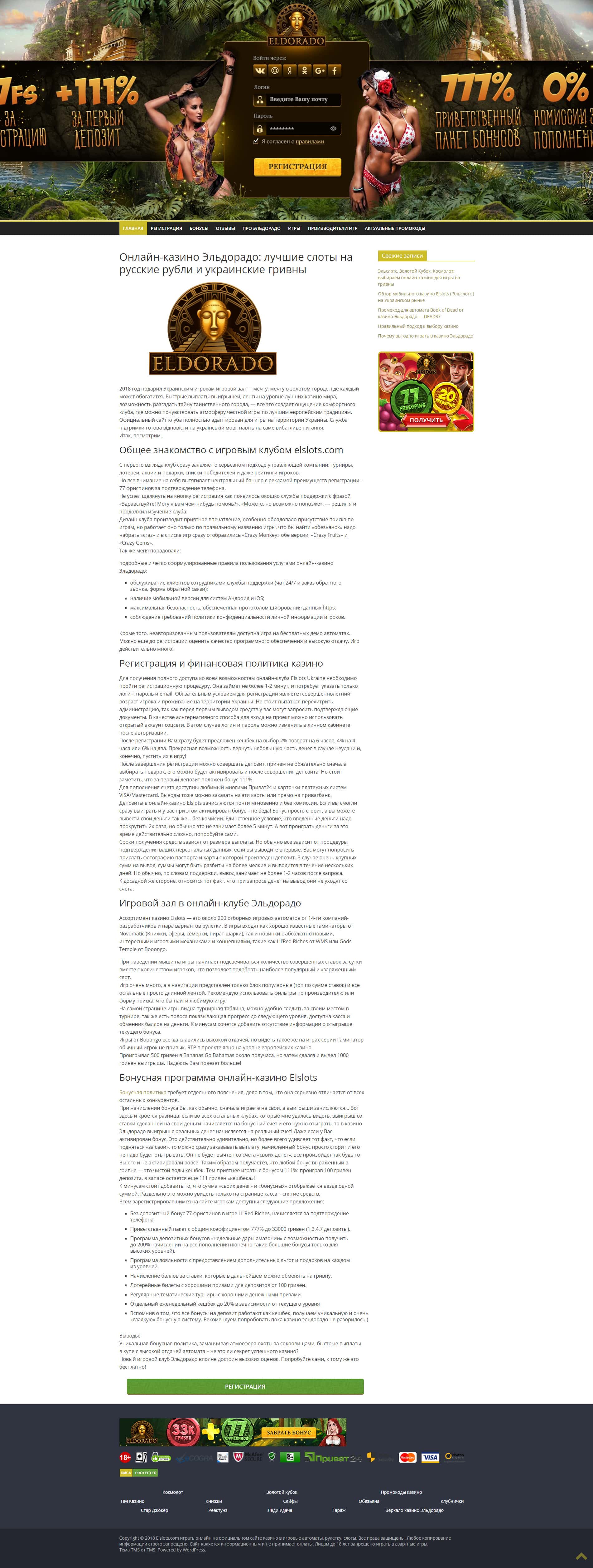 Ниже представлена главная страница мошеннической конторы EldoradoCasino, с помощью которой они собирают лохов, дабы содрать с них как можно больше денег.