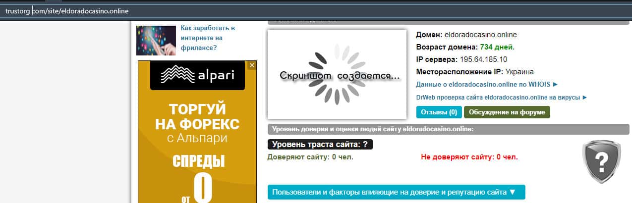 Мошенническое казино "eldoradocasino online" также не ищется в поисковике Гугл и по запросам сайта, только без домена, что показывает их непопулярность.