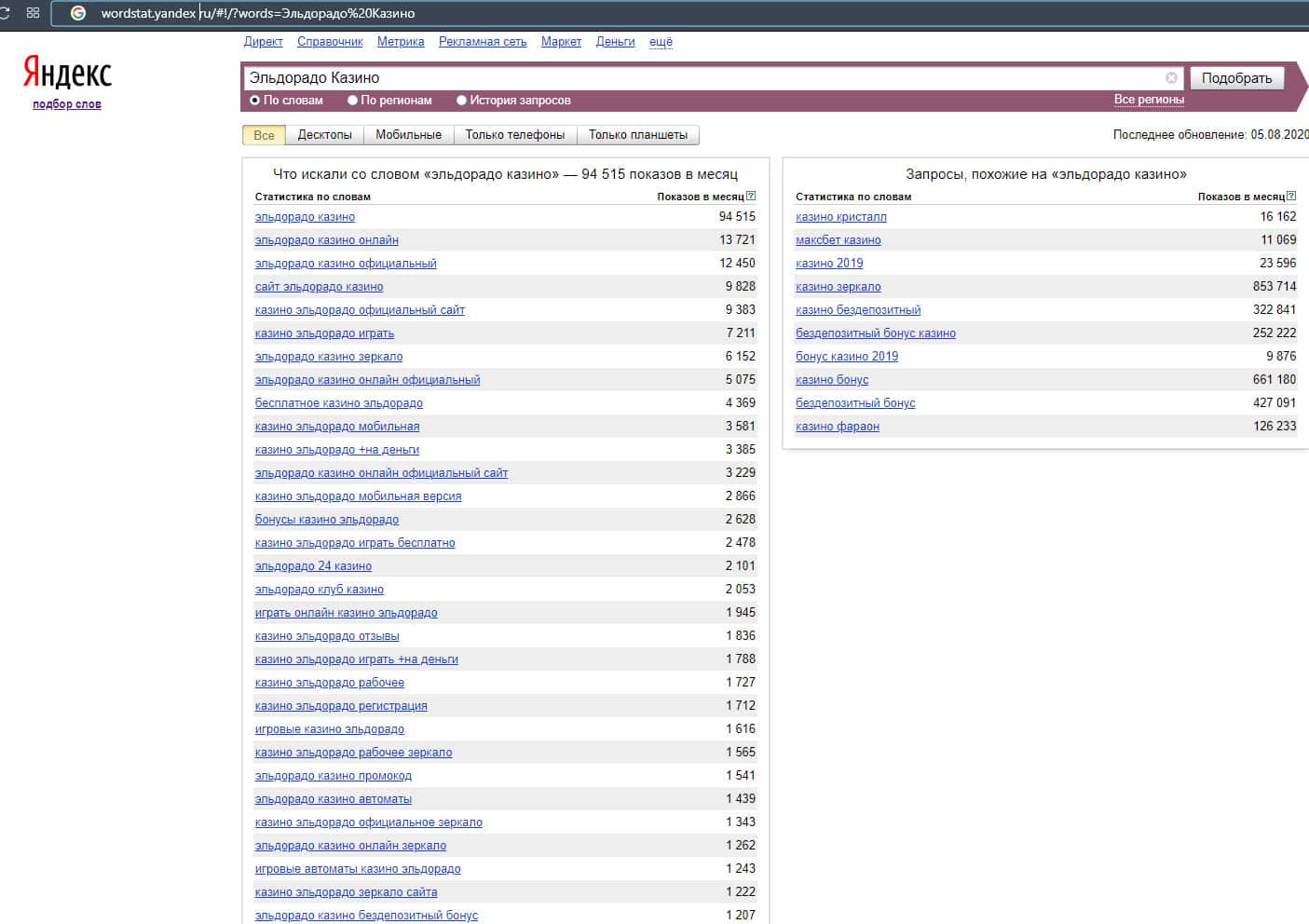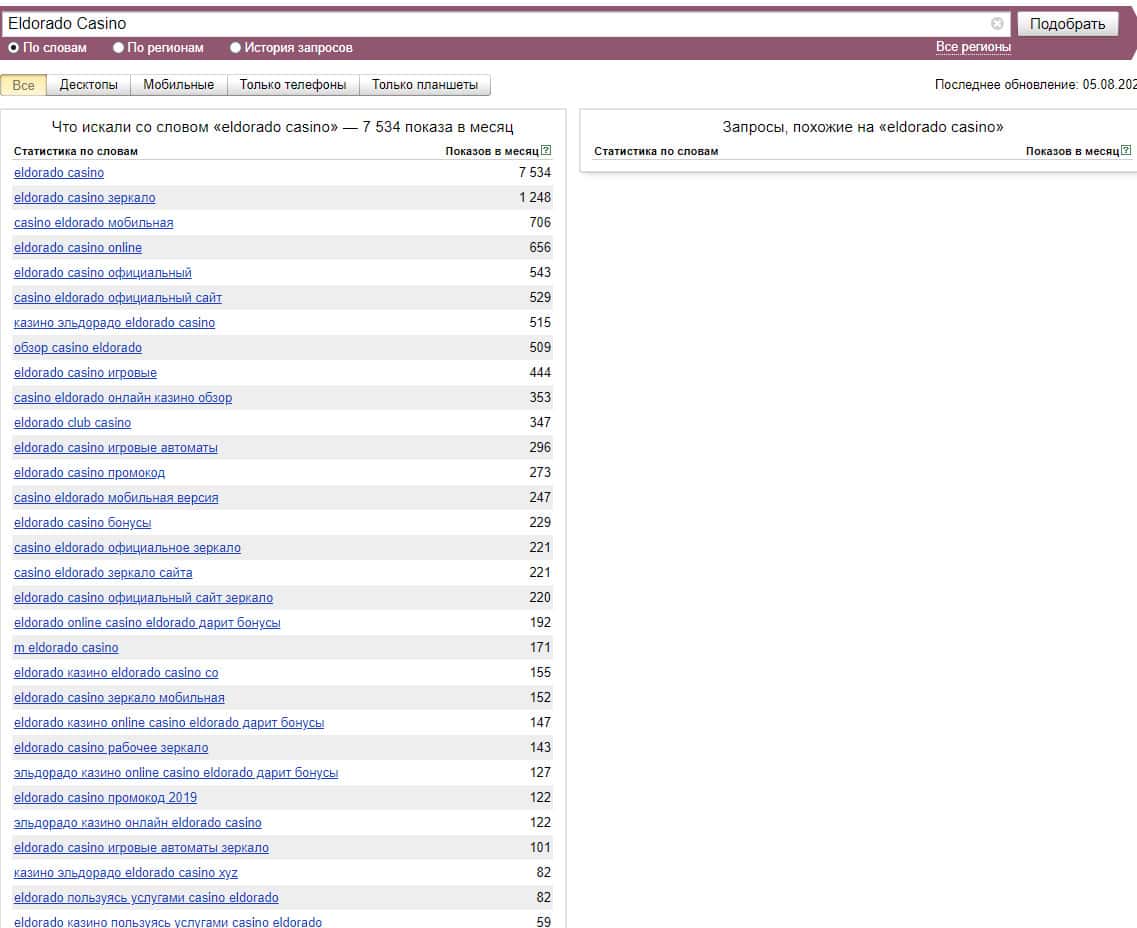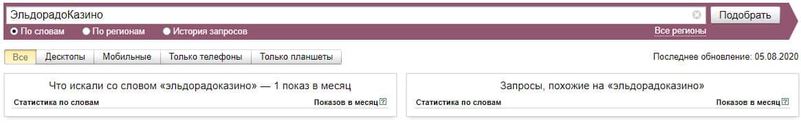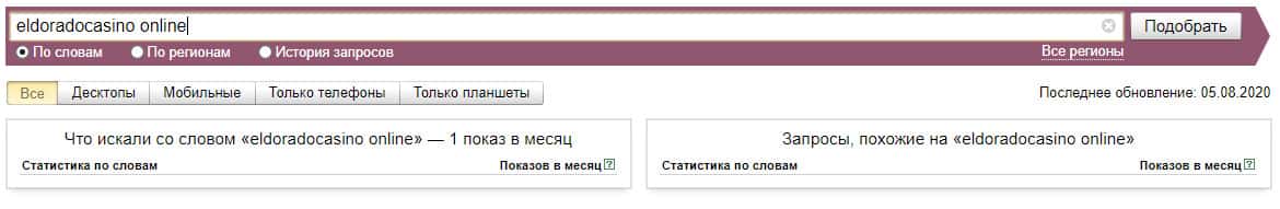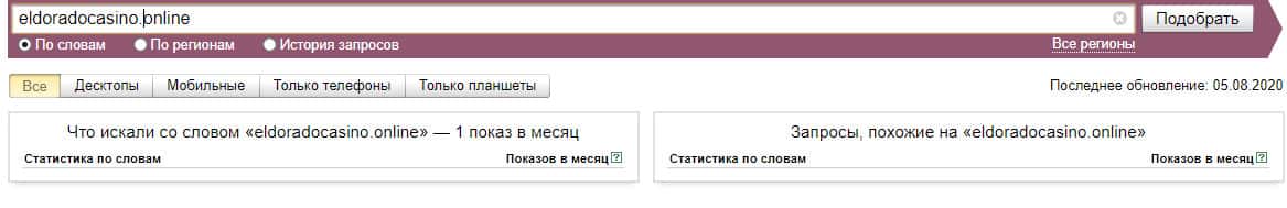 Мы также пробили сайт без точки в домене "eldoradocasino online" и система Яндекс Вордстат выдала 1 запрос за последний месяц.