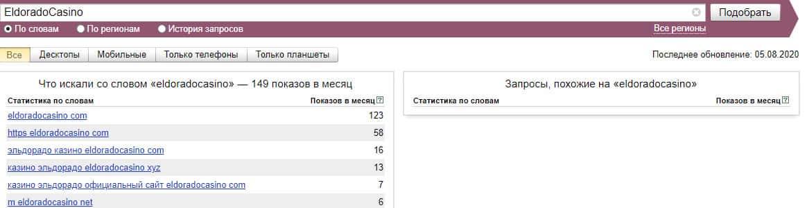 Информация о запросе бренда "EldoradoCasino" на сайте Яндекс Вордстат не сильно распространенная, и набрала 149 показов за месяц.