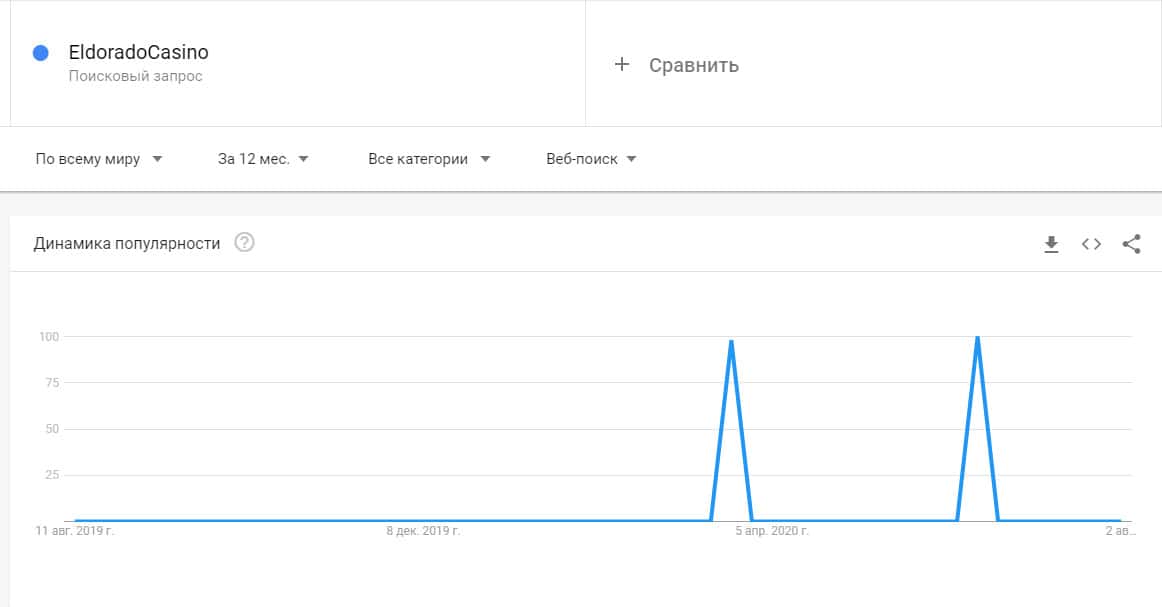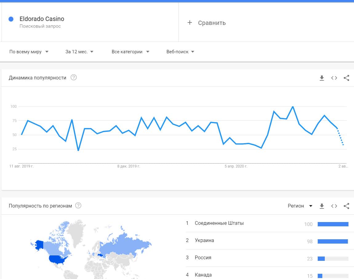 По поводу запроса бренда "EldoradoCasino", шулерская организация не набрала популярности, так как в Гугл очень редко совершались запросы.