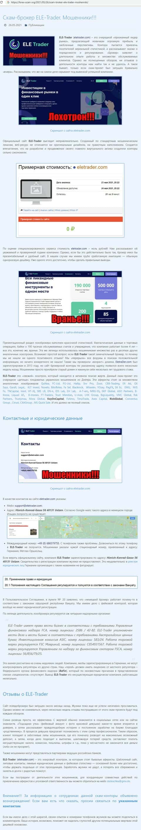 Известный веб-сервис fоrex-scam org указал на множество негативных сторон лжеброкера ELETrader: от отсутствия лицензии до отсутствия юридической документации, регистрации.