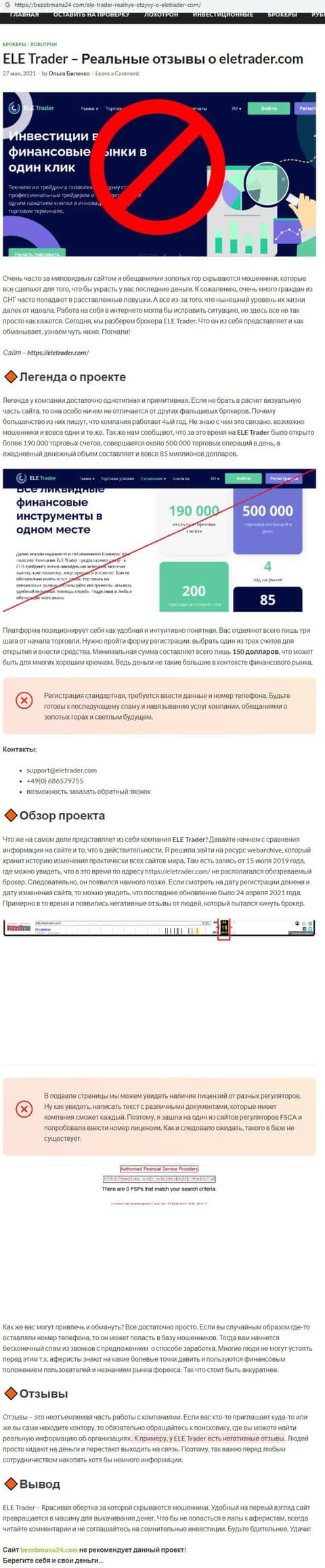 При обзоре шулерского брокера ELETrader авторы сайта otziv-broker com делают акцент на том, что брокер ведет деятельность нелегально и не собирается исправлять данную ситуацию.