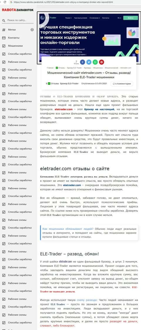Популярный интернет-сайт rabota-zarabotok ru сообщил о том, что ЕЛЕ Трейдер практикует на постоянной основе невывод денежных средств своим клиентам. Это обычные кидалы.